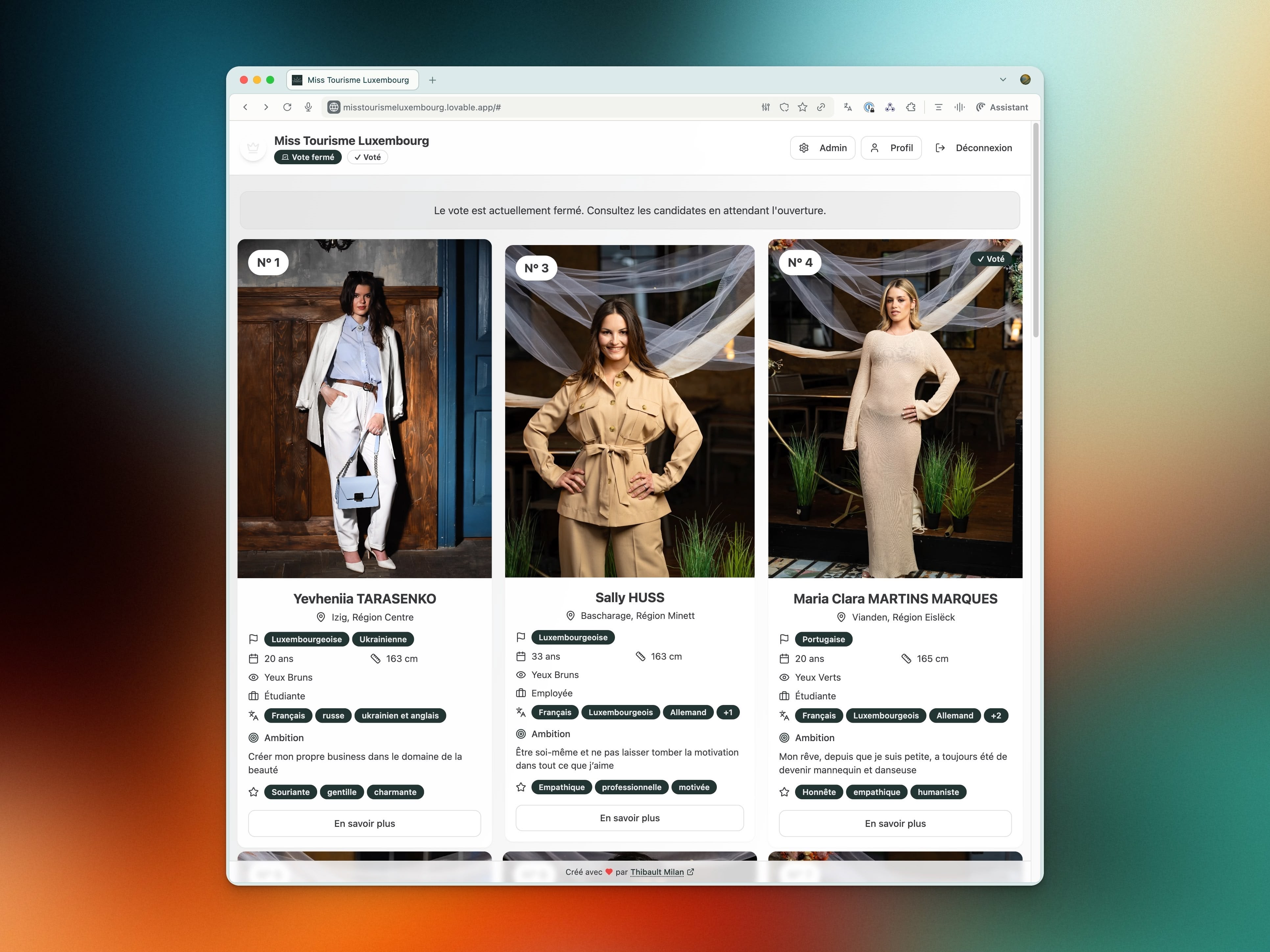 Yesterday was the Miss Tourisme Luxembourg election. Like previous years, I handled the online voting system — but this time I rebuilt it from the ground up. I moved away from a low‑code base (Glide) to a custom build on Lovable + Supabase + Postmark, “vibe‑coded” in two days. The goal wasn’t just to ship fast; it was to make the vote trustworthy, observable, and immediately usable on stage without any manual cleanup.